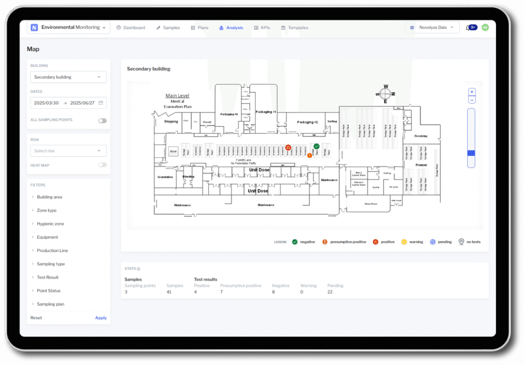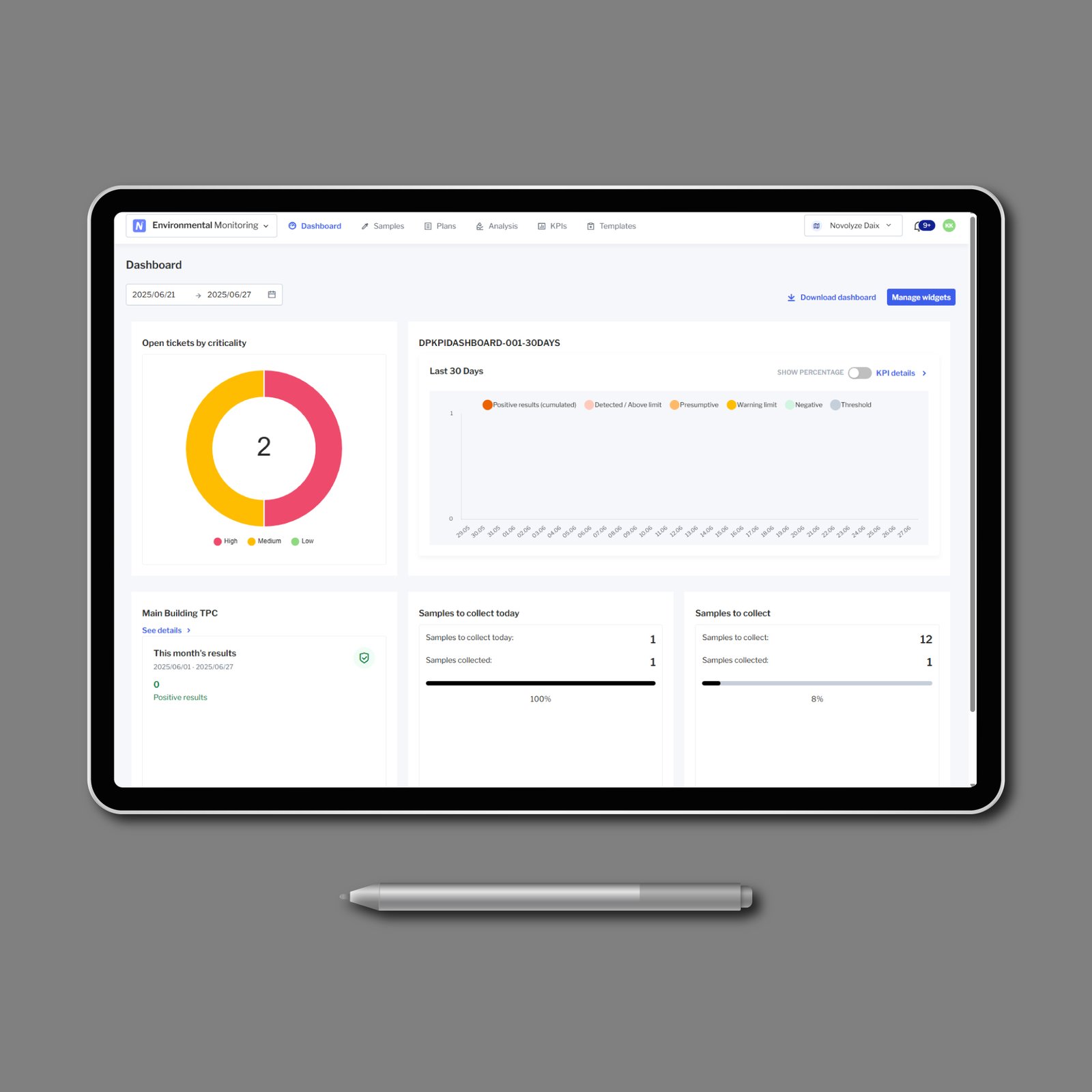 Move beyond manual logs and sampling spreadsheets. Novolyze Environmental Monitoring lets you schedule, collect, and analyze environmental samples digitally – accelerating root cause analysis, CAPAs, and trending for pathogen control.