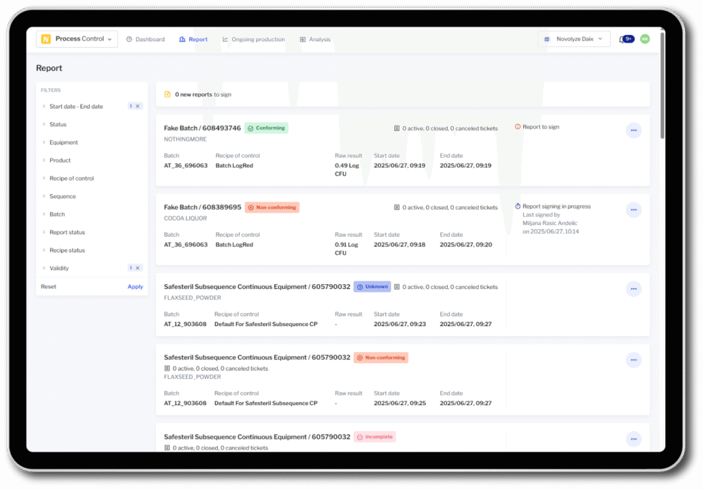 Ensure food safety and regulatory compliance with real-time oversight of thermal processing. Novolyze Process Control helps automate and digitize validation, monitoring, and documentation of critical control points – empowering your team to react faster and reduce risk.